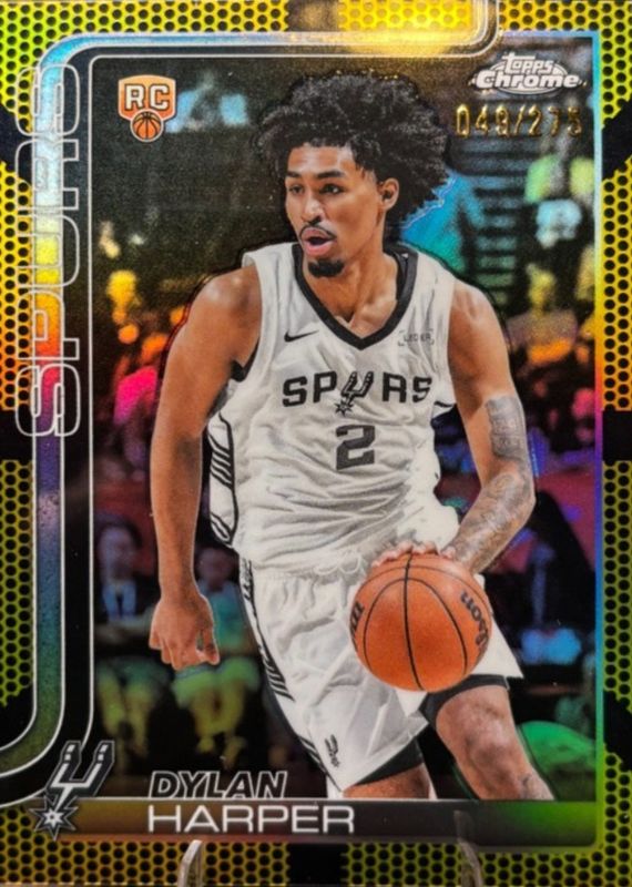 The Dylan Harper 2025 Topps Chrome #252 Yellow Basketball Refractor /275 Rookie card in Raw condition has moved down -$68.50 (-46.1%) in the last 30 days and was last sold for $80.00 .