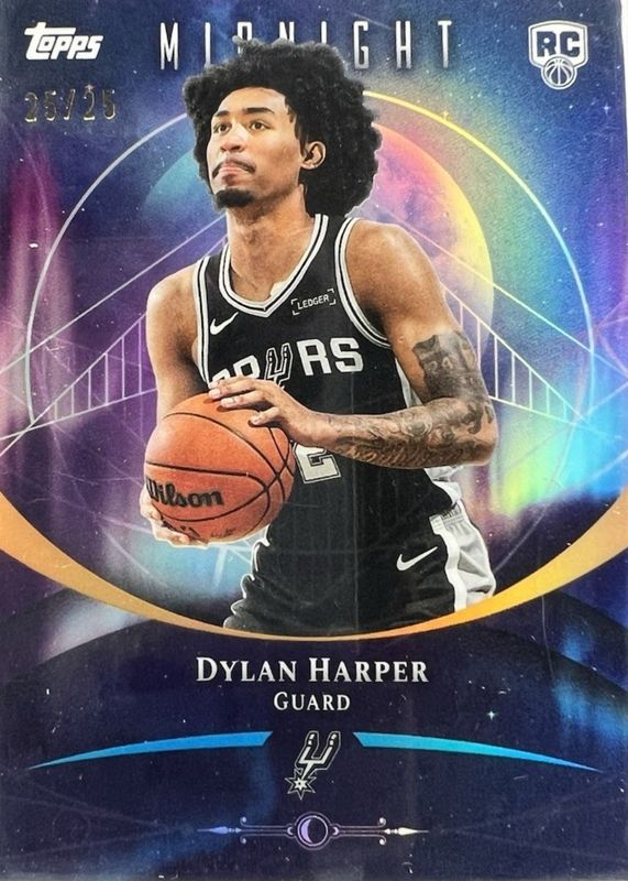 The Dylan Harper 2025 Topps Midnight #62 Moonrise /25 Rookie card in Raw condition has moved up $24.00 (+57.1%) in the last 30 days and was last sold for $66.00 .