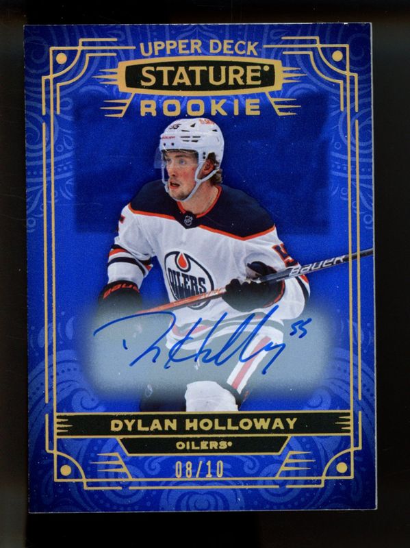 The Dylan Holloway 2022 Upper Deck Stature #140 Autographs - Blue /5 Rookie card is 1 of 48 Dylan Holloway's card variations in the 2022 Upper Deck Stature set being tracked by Sports Card Investor, including Base /399, Green /99, Photo Variant /99, Red /75, and Photo Variant Green /66.