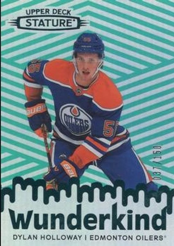 The Dylan Holloway 2022 Upper Deck Stature #W-13 Wunderkind - Green /150 Rookie card is 1 of 48 Dylan Holloway's card variations in the 2022 Upper Deck Stature set being tracked by Sports Card Investor, including Base /399, Green /99, Photo Variant /99, Red /75, and Photo Variant Green /66.