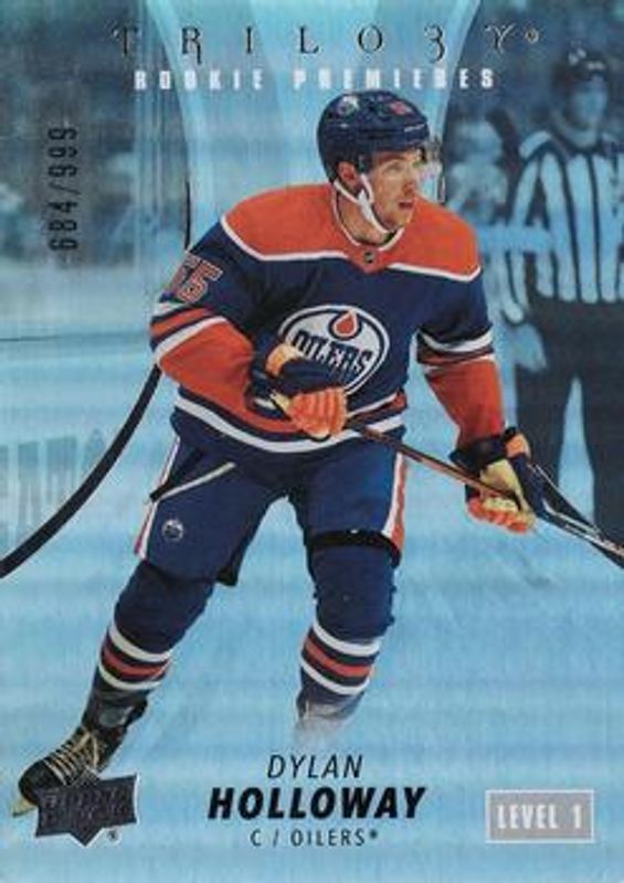 The Dylan Holloway 2022 Upper Deck Trilogy #143 Base /699 Rookie card is 1 of 47 Dylan Holloway's card variations in the 2022 Upper Deck Trilogy set being tracked by Sports Card Investor, including #243 Base /699, #193 Base /699, #243 Black Foil Memorabilia /499, #143 Black Foil Memorabilia /499, and #193 Black Foil Memorabilia /499.