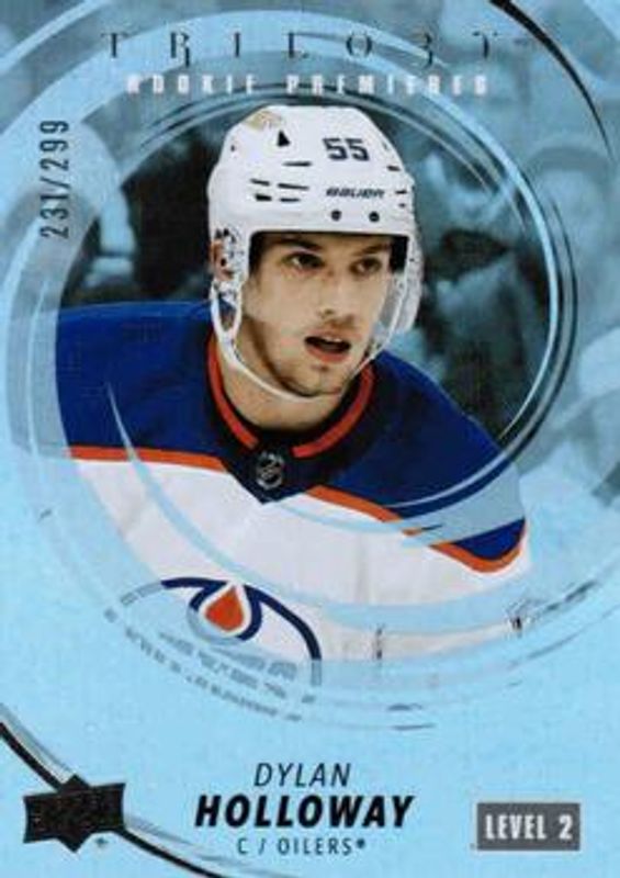 The Dylan Holloway 2022 Upper Deck Trilogy #243 Base /699 Rookie card is 1 of 47 Dylan Holloway's card variations in the 2022 Upper Deck Trilogy set being tracked by Sports Card Investor, including #143 Base /699, #193 Base /699, #243 Black Foil Memorabilia /499, #143 Black Foil Memorabilia /499, and #193 Black Foil Memorabilia /499.
