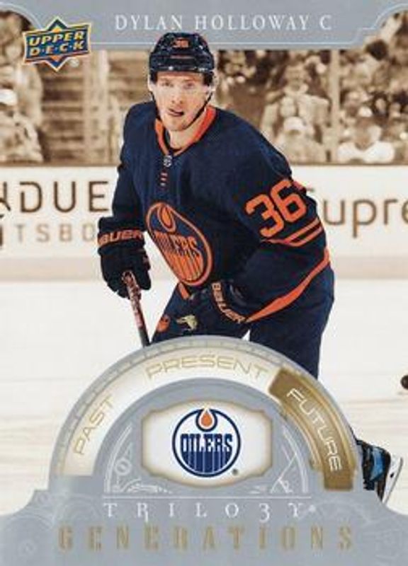 The Dylan Holloway 2022 Upper Deck Trilogy #TG-13C Generations Rookie card is 1 of 47 Dylan Holloway's card variations in the 2022 Upper Deck Trilogy set being tracked by Sports Card Investor, including #243 Base /699, #143 Base /699, #193 Base /699, #243 Black Foil Memorabilia /499, and #143 Black Foil Memorabilia /499.