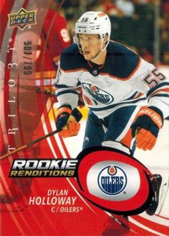 The Dylan Holloway 2022 Upper Deck Trilogy #RR-3 Rookie Renditions - Red /799 card is 1 of 47 Dylan Holloway's card variations in the 2022 Upper Deck Trilogy set being tracked by Sports Card Investor, including #243 Base /699, #143 Base /699, #193 Base /699, #243 Black Foil Memorabilia /499, and #143 Black Foil Memorabilia /499.