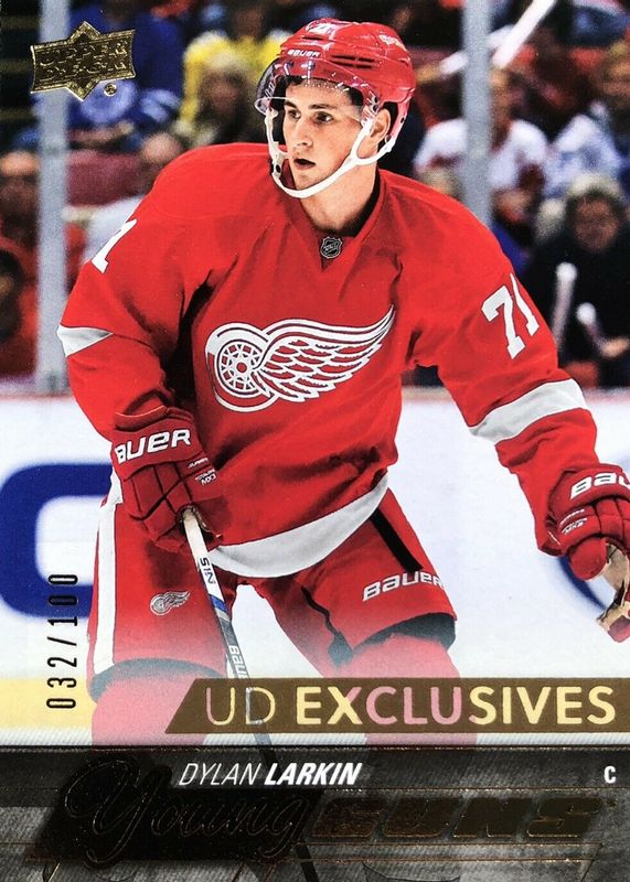 The Dylan Larkin 2015 Upper Deck #228 Young Guns - UD Exclusives /100 Rookie card in Raw condition has not changed in price in the last 30 days and was last sold for $238.16 .