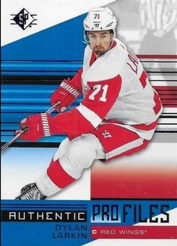 The Dylan Larkin 2019 SP #AP-DL Authentic Profiles - Blue card is 1 of 5 Dylan Larkin's card variations in the 2019 SP set being tracked by Sports Card Investor, including Base /1199, Blue, Authentic Profiles Jersey, and Authentic Profiles /649.