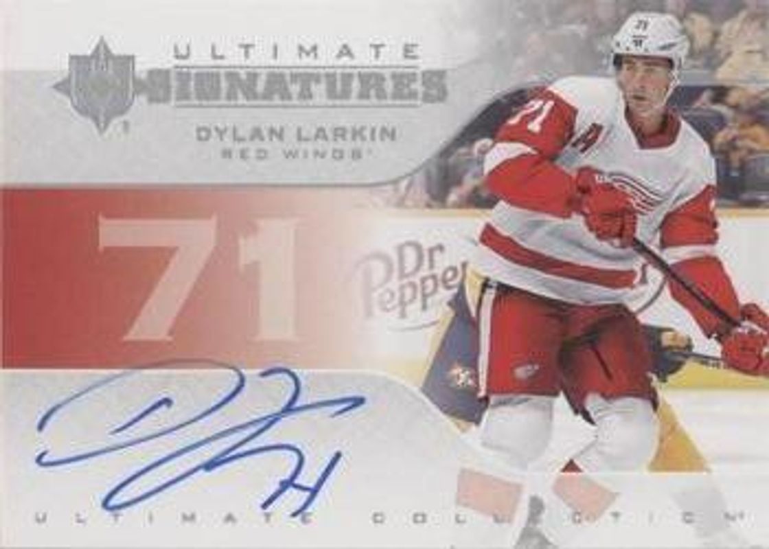 The Dylan Larkin 2020 Upper Deck Ultimate Collection #US-DL 2019 Upper Deck Ultimate Collection Update: Ultimate Signatures card is 1 of 16 Dylan Larkin's card variations in the 2020 Upper Deck Ultimate Collection set being tracked by Sports Card Investor, including Base /299, Gold /35, Jumbo Patch /15, Onyx Black /5, and Shield Patch /1.