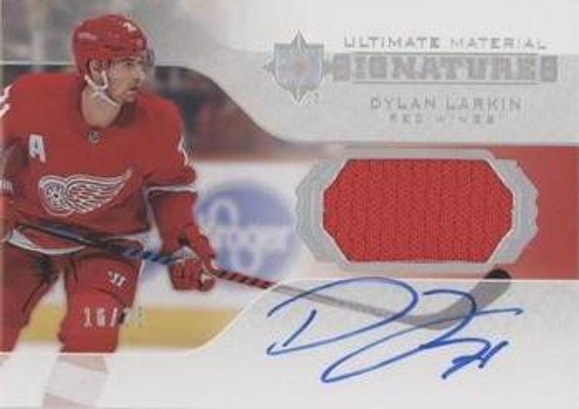 The Dylan Larkin 2020 Upper Deck Ultimate Collection #UMS-DL 2019 Upper Deck Ultimate Collection Update /299 card is 1 of 16 Dylan Larkin's card variations in the 2020 Upper Deck Ultimate Collection set being tracked by Sports Card Investor, including Base /299, Gold /35, Jumbo Patch /15, Onyx Black /5, and Shield Patch /1.