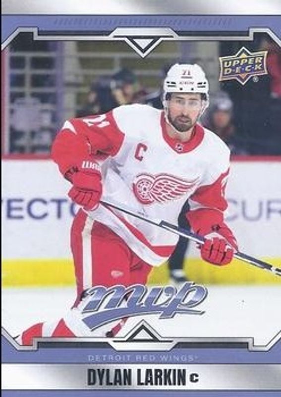 The Dylan Larkin 2024 Upper Deck MVP #140 Base card is 1 of 15 Dylan Larkin's card variations in the 2024 Upper Deck MVP set being tracked by Sports Card Investor, including Gold Script, Silver Script, Super Script /25, Printing Plates Black /1, and Printing Plates Cyan /1.