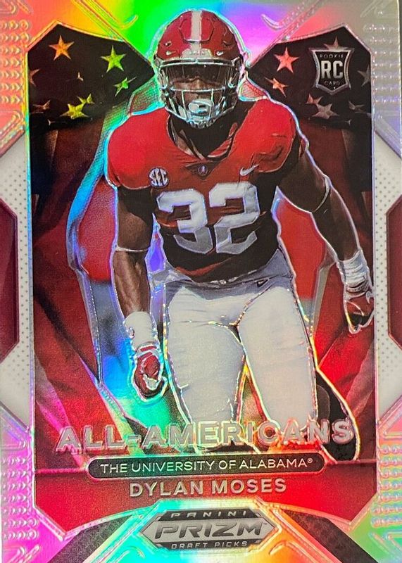 Dylan Moses' Football cards are available in at least 2 sets. Dylan Moses' biggest 7-day price movers are 2021 Prizm Draft Picks #190 All-Americans - Silver, 2021 Prizm Draft Picks #190 All-Americans - Green, and 2021 Prizm Draft Picks #140 Green Pulsar /25.