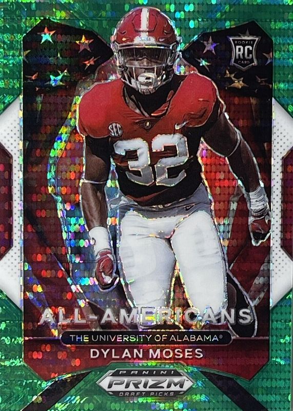 The Dylan Moses 2021 Prizm Draft Picks #190 All-Americans - Green Pulsar /25 Rookie card in Raw condition has not changed in price in the last 30 days and was last sold for $1.04 .