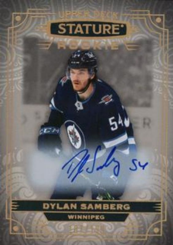 The Dylan Samberg 2022 Upper Deck Stature #159 Autographs /99 Rookie card is 1 of 48 Dylan Samberg's card variations in the 2022 Upper Deck Stature set being tracked by Sports Card Investor, including Base /399, Green /99, Photo Variant /99, Red /75, and Photo Variant Green /66.