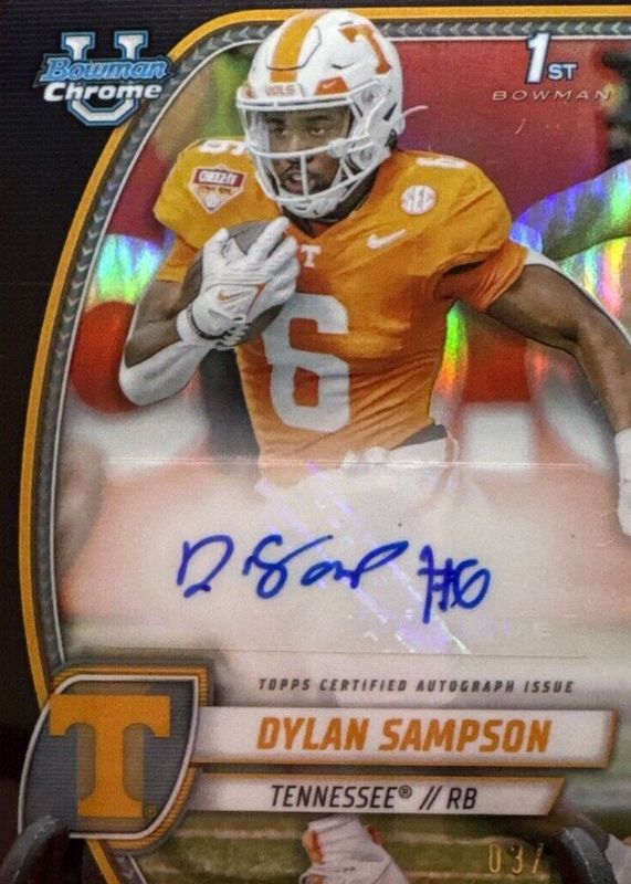 This card is 1 of 14 Dylan Sampson's card variations in the 2024 Bowman Chrome University set being tracked by Sports Card Investor, including Prospect Auto (1st), Prospect Auto - Stealth Refractor (1st), Prospect Auto - Refractor /299 (1st), Prospect Auto - Fuchsia Refractor /150 (1st), and Prospect Auto - Green Refractor /99 (1st).