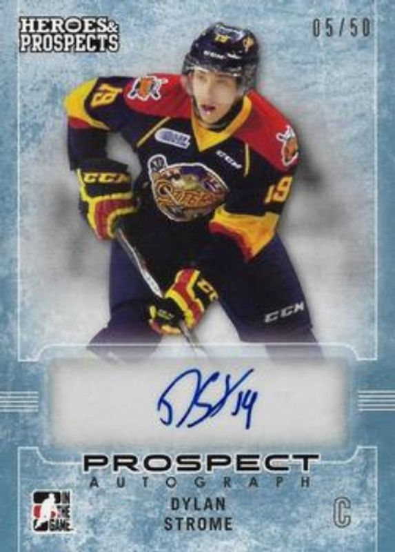 The Dylan Strome 2014 In The Game Heroes & Prospects #23 Prospect Autographs Blue /50 card is 1 of 43 Dylan Strome's card variations in the 2014 In The Game Heroes & Prospects set being tracked by Sports Card Investor, including 1990 Leaf Tribute, Complete Jersey Prospect Blue, Complete Jersey Prospect Emerald, Draft Prospect Auto Blue, and Game Used Auto Jersey - Silver.
