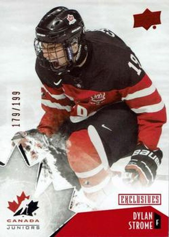 The Dylan Strome 2015 Upper Deck Team Canada Juniors #91 Exclusives /199 card is 1 of 27 Dylan Strome's card variations in the 2015 Upper Deck Team Canada Juniors set being tracked by Sports Card Investor, including #77 Base, #91 Base, #7 Base, #91 Gold, and #7 Gold.