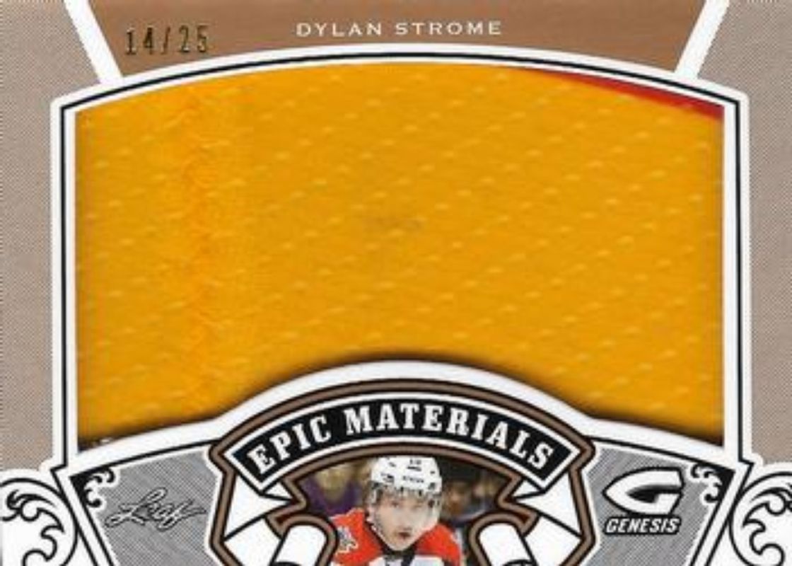 The Dylan Strome 2016 Leaf Genesis #EM-23 Epic Materials /25 Rookie card is 1 of 17 Dylan Strome's card variations in the 2016 Leaf Genesis set being tracked by Sports Card Investor, including Epic Materials Emerald /15, Epic Materials Patch Bronze /10, Epic Materials Purple /10, Epic Materials Patch Emerald /5, and Epic Materials Platinum /5.