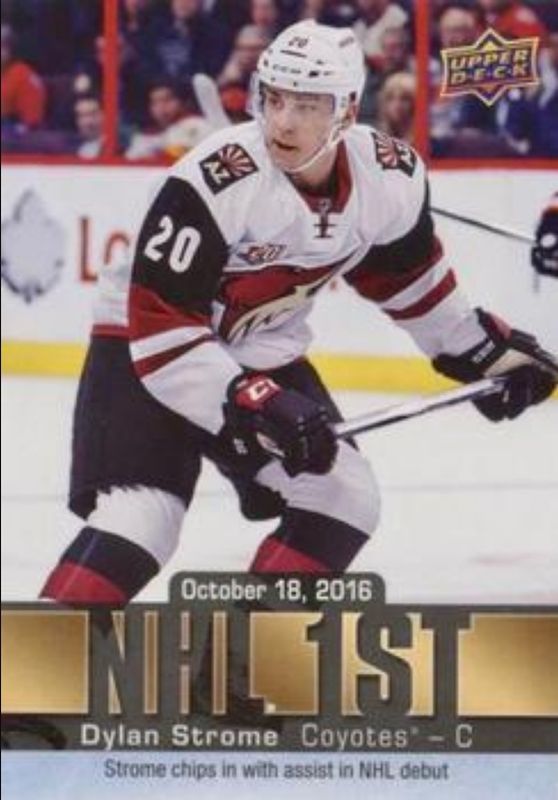 The Dylan Strome 2016 Upper Deck #NF-18 NHL Firsts Rookie card is 1 of 27 Dylan Strome's card variations in the 2016 Upper Deck set being tracked by Sports Card Investor, including Young Guns Base, Young Guns Canvas, Young Guns - Clear Cut, Young Guns - Gold Rainbow Foil, and Young Guns - Jumbo.