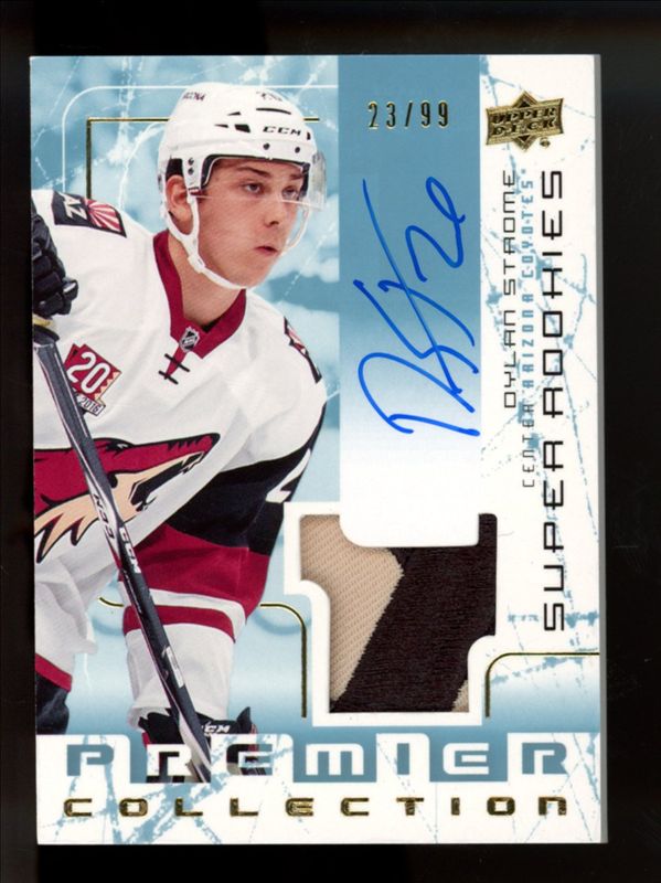 The Dylan Strome 2016 Upper Deck Premier #SSR-DS 2003 Tribute Rookie Autographs Patch /99 card is 1 of 15 Dylan Strome's card variations in the 2016 Upper Deck Premier set being tracked by Sports Card Investor, including Base /299, Silver Spectrum Autographs /10, Premier Signatures Booklets, Rookies Jersey, and Premier Rookies /299.