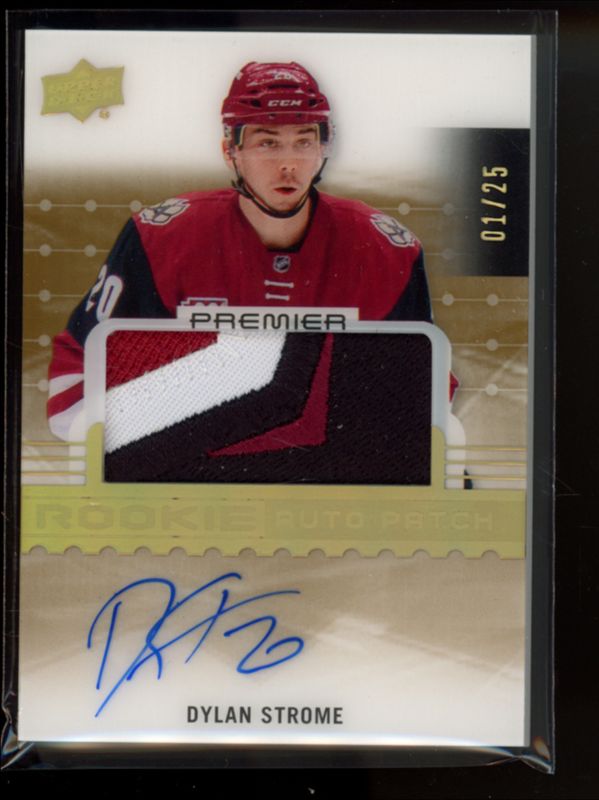 The Dylan Strome 2016 Upper Deck Premier #80 Acetate Rookie Autographs: Gold Spectrum Patch /25 card is 1 of 15 Dylan Strome's card variations in the 2016 Upper Deck Premier set being tracked by Sports Card Investor, including Base /299, Silver Spectrum Autographs /10, Premier Signatures Booklets, Rookies Jersey, and Premier Rookies /299.