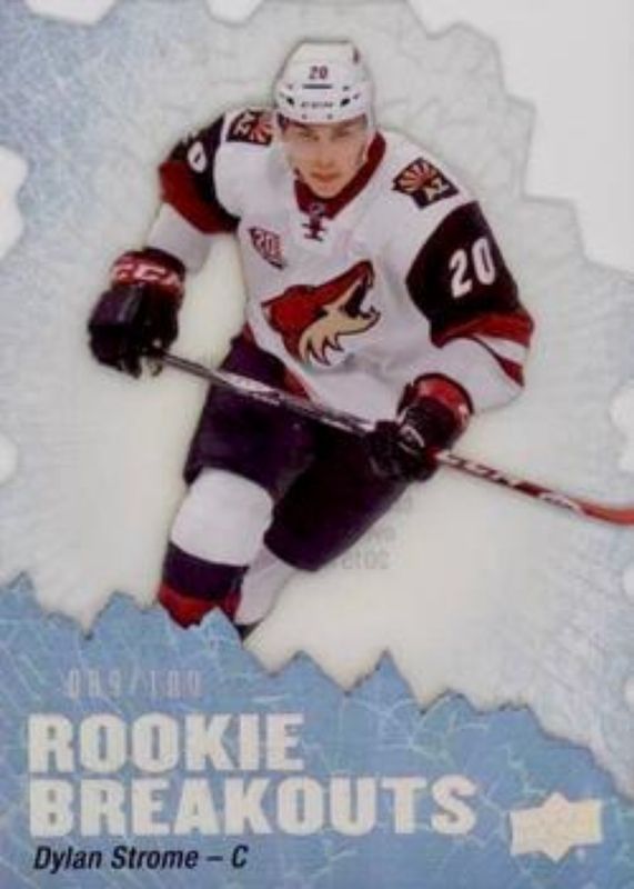 The Dylan Strome 2016 Upper Deck #RB4 Rookie Breakouts /100 card is 1 of 27 Dylan Strome's card variations in the 2016 Upper Deck set being tracked by Sports Card Investor, including Young Guns Base, Young Guns Canvas, Young Guns - Clear Cut, Young Guns - Gold Rainbow Foil, and Young Guns - Jumbo.