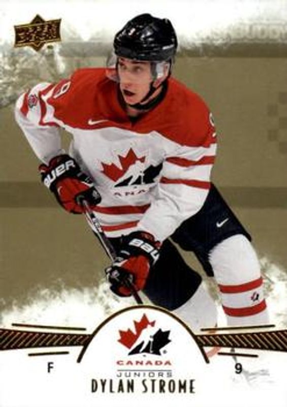 The Dylan Strome 2016 Upper Deck Team Canada Juniors #23 Gold /16 Rookie card is 1 of 39 Dylan Strome's card variations in the 2016 Upper Deck Team Canada Juniors set being tracked by Sports Card Investor, including #23 Base, #83 Base, #102 Base, #83 Exclusives /175, and #23 Exclusives /175.