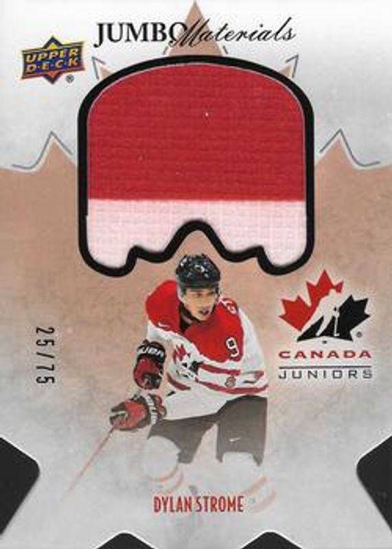 The Dylan Strome 2016 Upper Deck Team Canada Juniors #JS-DS Jumbo Materials /75 Rookie card is 1 of 39 Dylan Strome's card variations in the 2016 Upper Deck Team Canada Juniors set being tracked by Sports Card Investor, including #23 Base, #83 Base, #102 Base, #83 Exclusives /175, and #23 Exclusives /175.