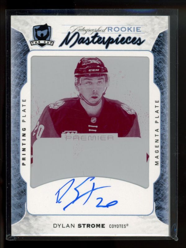 The Dylan Strome 2016 Upper Deck The Cup #PREM-80 Autographed Rookie Masterpieces Magenta /1 card is 1 of 80 Dylan Strome's card variations in the 2016 Upper Deck The Cup set being tracked by Sports Card Investor, including Base /249, Team Canada Autographs, Gold Patch /24, Gold Spectrum /12, and Red Tag /8.