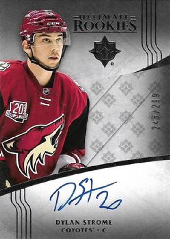 The Dylan Strome 2016 Upper Deck Ultimate Collection #140 z Ultimate Rookies Autographs /299 card is 1 of 14 Dylan Strome's card variations in the 2016 Upper Deck Ultimate Collection set being tracked by Sports Card Investor, including Base /299, Ultimate Rookies Jersey Silver /249, Ultimate Introductions Rookies Royal Red /61, Ultimate Rookies Autographs Patch Gold /49, and Onyx /10.