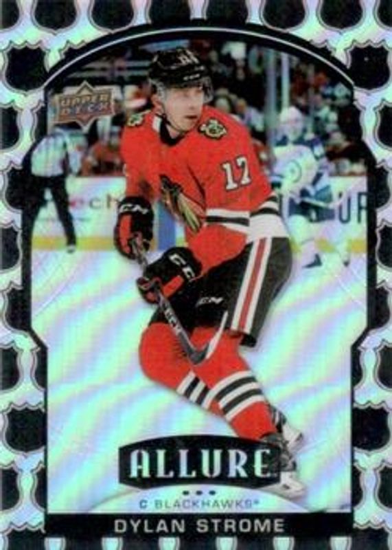 The Dylan Strome 2020 Upper Deck Allure #63 2005 Shield card is 1 of 38 Dylan Strome's card variations in the 2020 Upper Deck Allure set being tracked by Sports Card Investor, including Base, Black Rainbow, Blue China, Leopard, and Magenta.