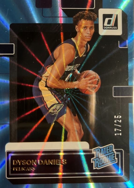 The Dyson Daniels 2022 Donruss #208 Holo Light Blue Laser /25 Rookie card in Raw condition has not changed in price in the last 30 days and was last sold for $15.00 .