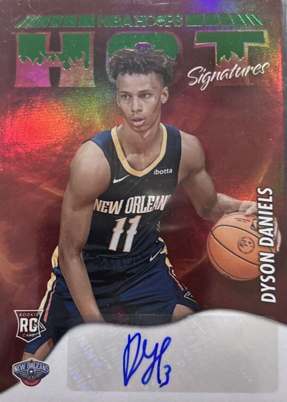 The Dyson Daniels 2022 Hoops #HSR-DYS Hot Signatures Rookies - Green card in Raw condition has not changed in price in the last 30 days and was last sold for $6.00 .