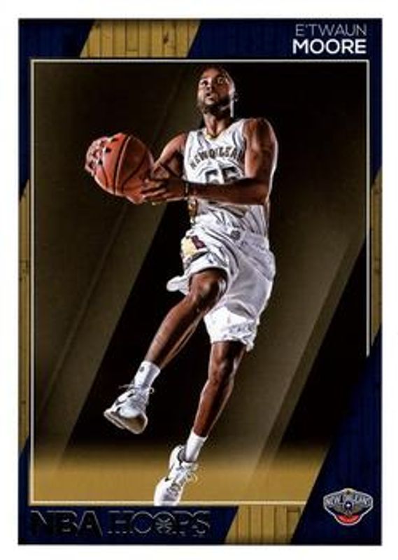 The E'Twaun Moore 2016 Hoops #168 Base card is 1 of 19 E'Twaun Moore's card variations in the 2016 Hoops set being tracked by Sports Card Investor, including Blue, Red Back, Teal Explosion, Green /149, and Silver /99.