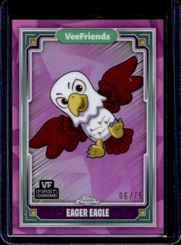 The Eager Eagle 2025 Topps Chrome VeeFriends #5 Pink Refractor /75 card is 1 of 22 Eager Eagle's card variations in the 2025 Topps Chrome VeeFriends set being tracked by Sports Card Investor, including Base, Refractor, Yellow Refractor, Shimmer Refractor /250, and RayWave Refractor /199.