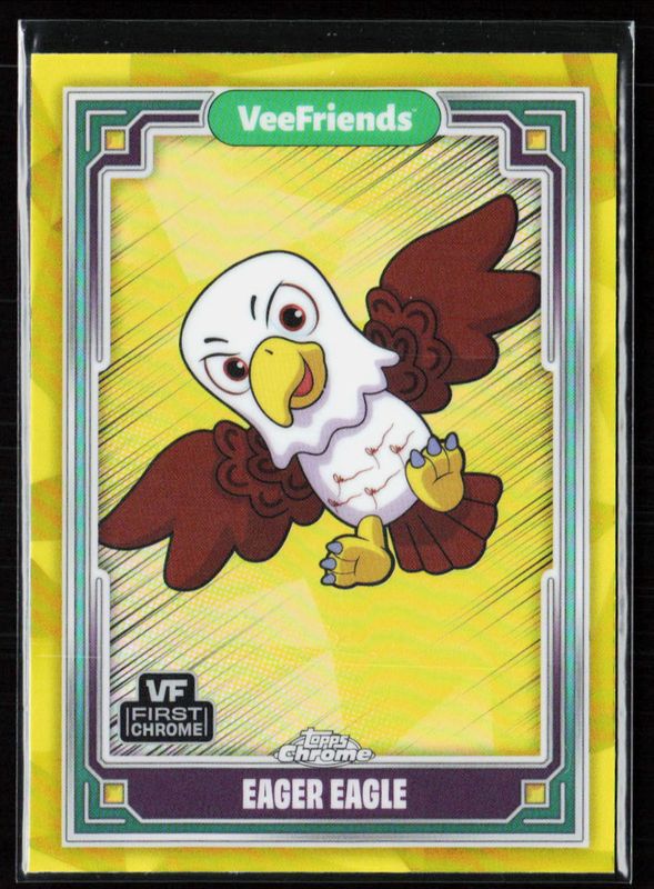 The Eager Eagle 2025 Topps Chrome VeeFriends #5 Yellow Refractor card is 1 of 22 Eager Eagle's card variations in the 2025 Topps Chrome VeeFriends set being tracked by Sports Card Investor, including Base, Refractor, Shimmer Refractor /250, RayWave Refractor /199, and Wave Refractor /150.