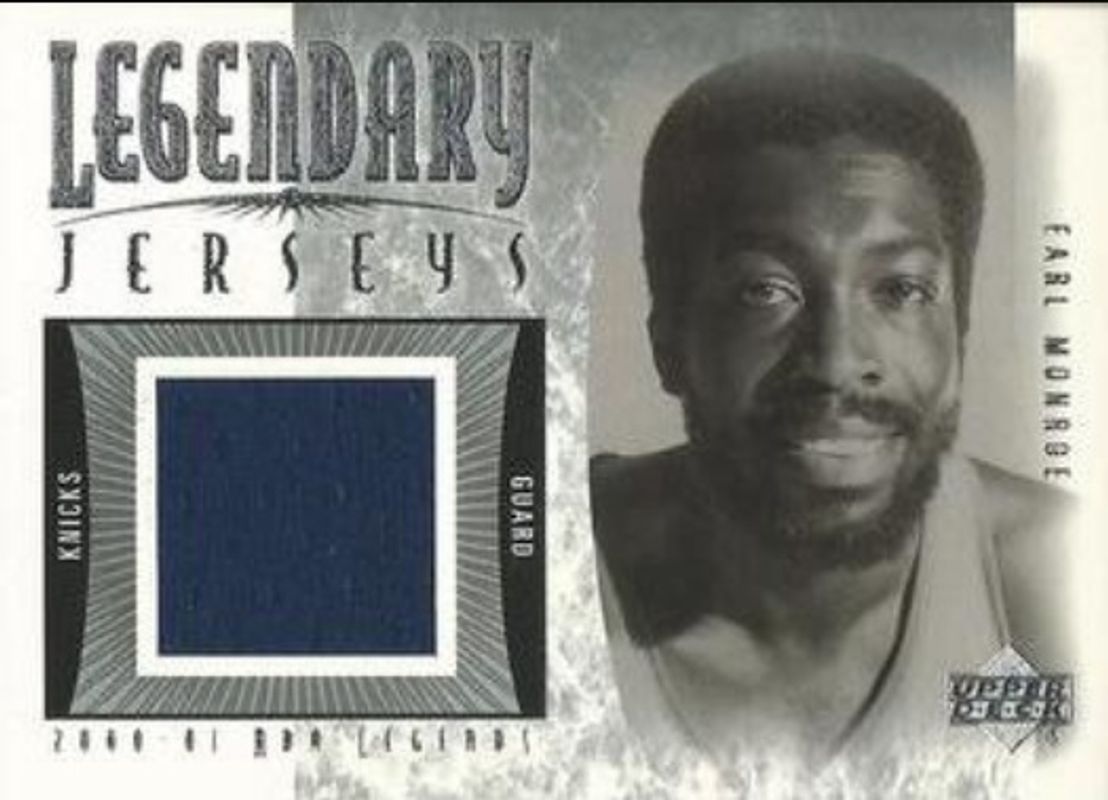 The Earl Monroe 2000 Upper Deck Legends #EM-J Legendary Jerseys card is 1 of 4 Earl Monroe's card variations in the 2000 Upper Deck Legends set being tracked by Sports Card Investor, including Base, Legendary Jerseys Autographed /50, and Legendary Signatures /10.