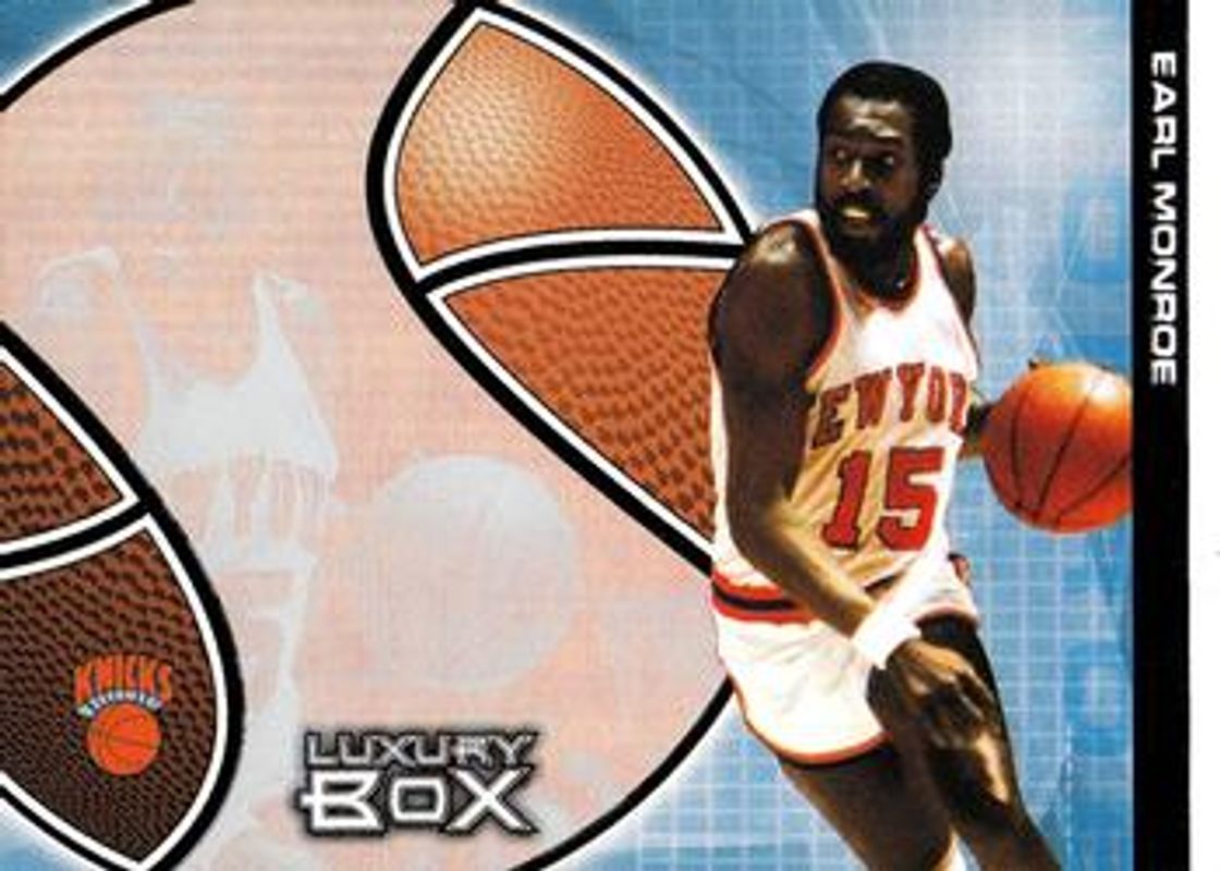 The Earl Monroe 2004 Topps Luxury Box #144 Base card is 1 of 9 Earl Monroe's card variations in the 2004 Topps Luxury Box set being tracked by Sports Card Investor, including Season Tickets, Tier Reserved /300, Loge Level /100, Main Reserved /25, and Luxury Box /1.