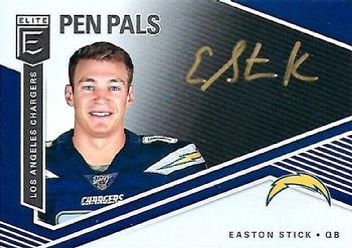 The Easton Stick 2019 Elite #PP-ES Pen Pals Black Gold Ink Rookie card is 1 of 22 Easton Stick's card variations in the 2019 Elite set being tracked by Sports Card Investor, including Green, Red /299, Purple /99, Status /97, and Orange /49.