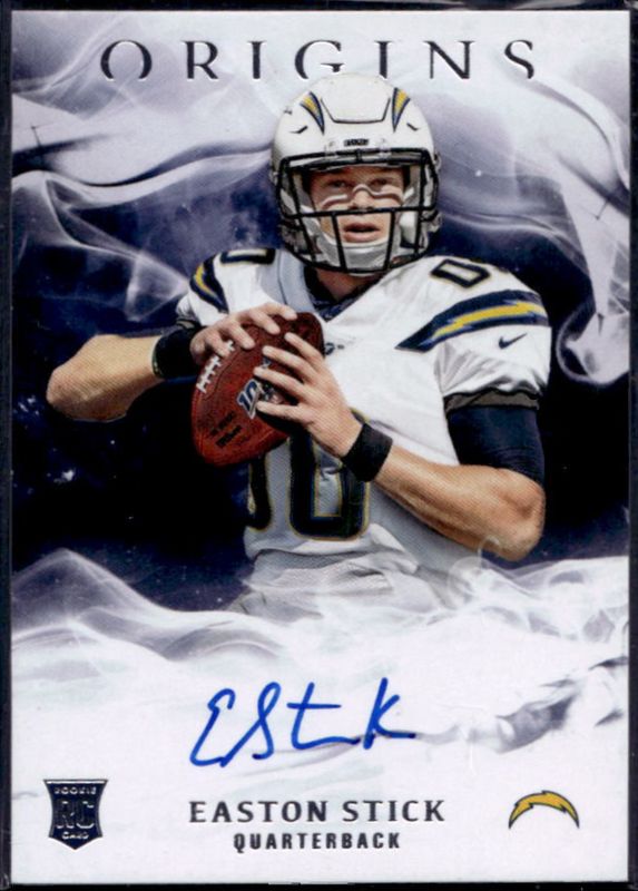 The Easton Stick 2019 Origins #RA-ES Rookie Autographs card is 1 of 31 Easton Stick's card variations in the 2019 Origins set being tracked by Sports Card Investor, including Base, Red /299, Orange /175, Blue /99, and Turquoise /25.
