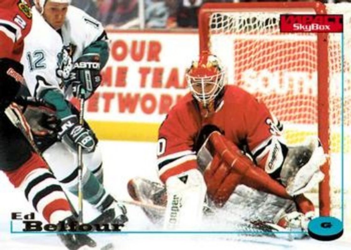The Ed Belfour 1996 Skybox Impact #17 Base card is 1 of 2 Ed Belfour's card variations in the 1996 Skybox Impact set being tracked by Sports Card Investor, including Zero Heroes.