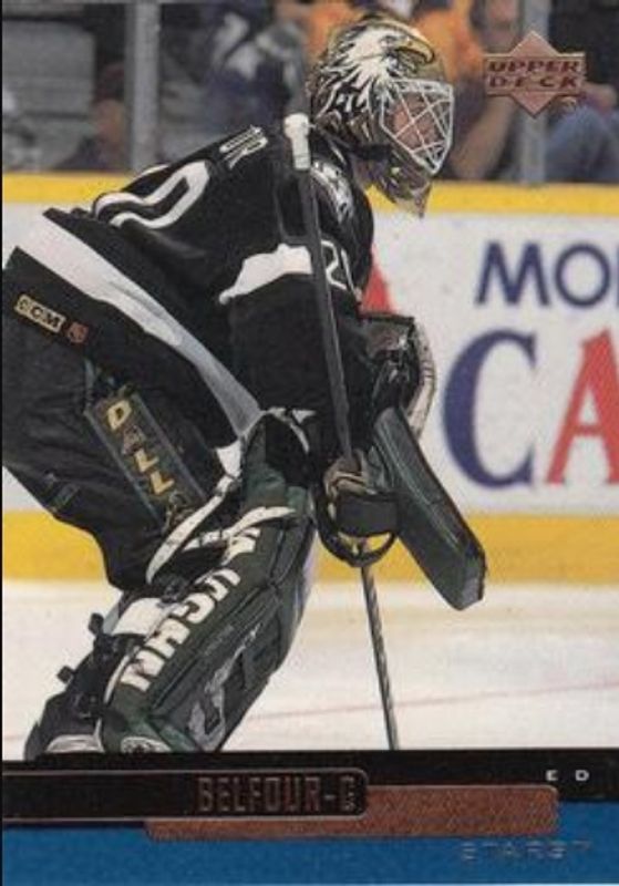 The Ed Belfour 1999 Upper Deck #44 Base card is 1 of 13 Ed Belfour's card variations in the 1999 Upper Deck set being tracked by Sports Card Investor, including UD Exclusives /100, UD Exclusives 1/1 /1, All Star Class, Game Jersey Patches (Series Two), and Ultimate Defense.