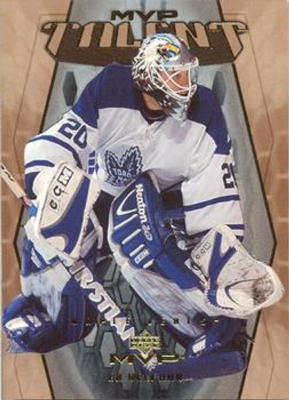 The Ed Belfour 2003 Upper Deck MVP #MT9 MVP Talent card is 1 of 9 Ed Belfour's card variations in the 2003 Upper Deck MVP set being tracked by Sports Card Investor, including Base, Silver Script /150, Gold Script /25, Red Script /25, and Masked Men.