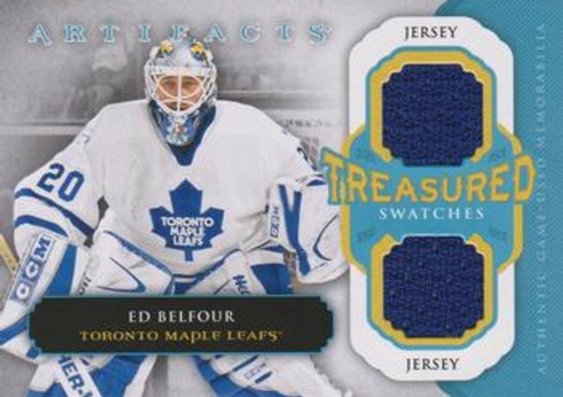 The Ed Belfour 2013 Upper Deck Artifacts #TS-EB Treasured Swatches Blue card is 1 of 16 Ed Belfour's card variations in the 2013 Upper Deck Artifacts set being tracked by Sports Card Investor, including Base /899, Ruby /299, Emerald /99, Sapphire /85, and Spectrum /25.