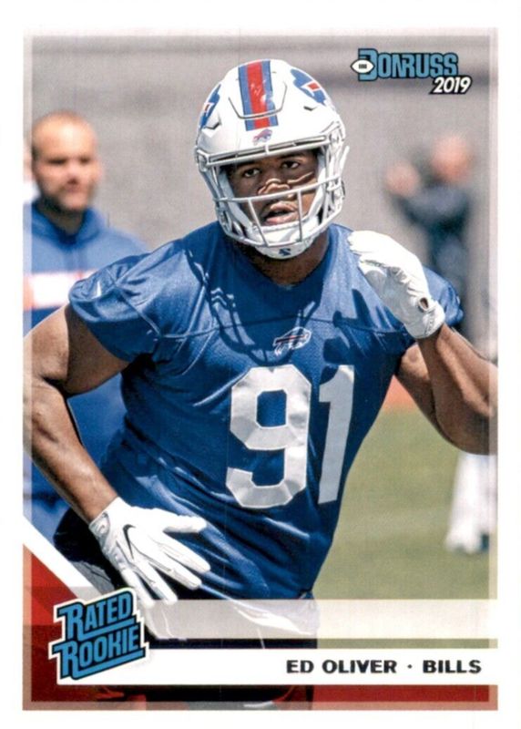 This card is 1 of 25 Ed Oliver's card variations in the 2019 Donruss set being tracked by Sports Card Investor, including Aqueous Test, Canvas, Jersey Number (/91), Press Proof Blue, and Press Proof Bronze.