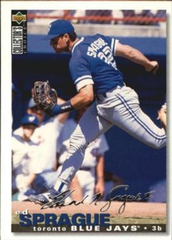 The Ed Sprague 1995 Upper Deck Collector's Choice #142 Silver Signatures card is 1 of 3 Ed Sprague's card variations in the 1995 Upper Deck Collector's Choice set being tracked by Sports Card Investor, including Base, and Gold Signatures.