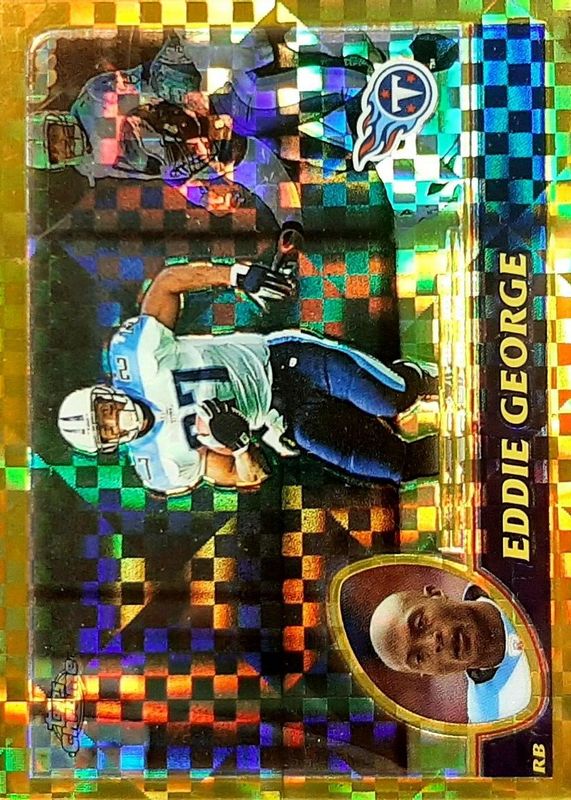 Eddie George's Football cards are available in at least 88 sets. Eddie George's biggest 7-day price movers are 2003 Topps Chrome #55 Gold X-Fractor /101, 2025 Leaf Metal #53 Printing Plates Black /1, and 2025 Leaf Metal #53 Prismatic Silver /149.