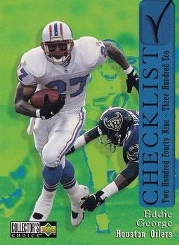 The Eddie George 1997 Upper Deck Collector's Choice #306 Base card is 1 of 10 Eddie George's card variations in the 1997 Upper Deck Collector's Choice set being tracked by Sports Card Investor, including #495 Base, #69 Base, #5 Jumbos 3x5, #ST19 Mini Standee, and #10 Names of the Game 3x5.
