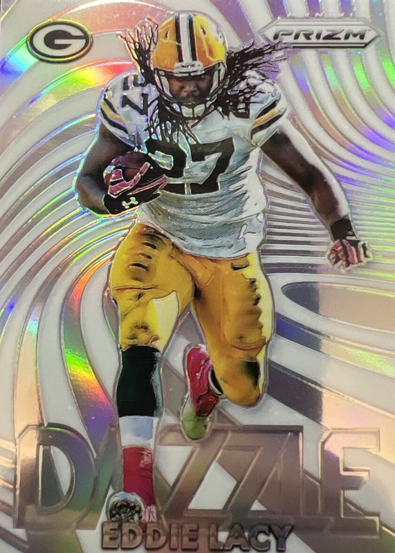 This card is 1 of 6 Eddie Lacy's card variations in the 2016 Prizm set being tracked by Sports Card Investor, including Razzle, Dazzle - Gold Mojo /10, Razzle - Gold Mojo /10, Dazzle - Black Finite /1, and Razzle - Black Finite /1.
