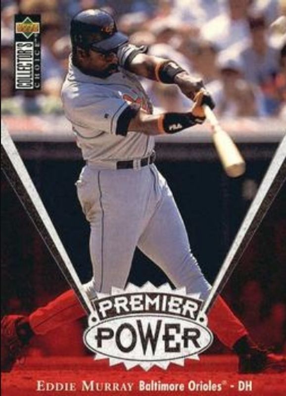 The Eddie Murray 1997 Upper Deck Collector's Choice #PP20 Premier Power card is 1 of 8 Eddie Murray's card variations in the 1997 Upper Deck Collector's Choice set being tracked by Sports Card Investor, including #40 Base, #250 Base, #40 Box Toppers, #PP20 Premier Power 3x5, and #PP20 Premier Power Gold.