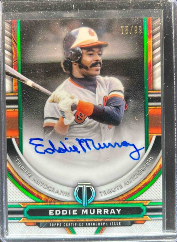 The Eddie Murray 2023 Topps Tribute #TA-EM Autographs - Green /99 card is 1 of 12 Eddie Murray's card variations in the 2023 Topps Tribute set being tracked by Sports Card Investor, including Autographs /199, Autographs - Blue /150, Autographs - Gold /75, Autographs - Purple /50, and Autographs - Orange /25.