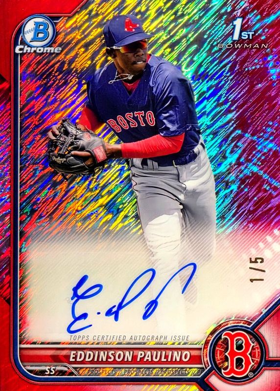 The Eddinson Paulino 2022 Bowman Chrome #CPA-EP Prospect Auto - Red Shimmer Refractor /5 (1st) card in Raw condition has not changed in price in the last 30 days and was last sold for $26.00 .